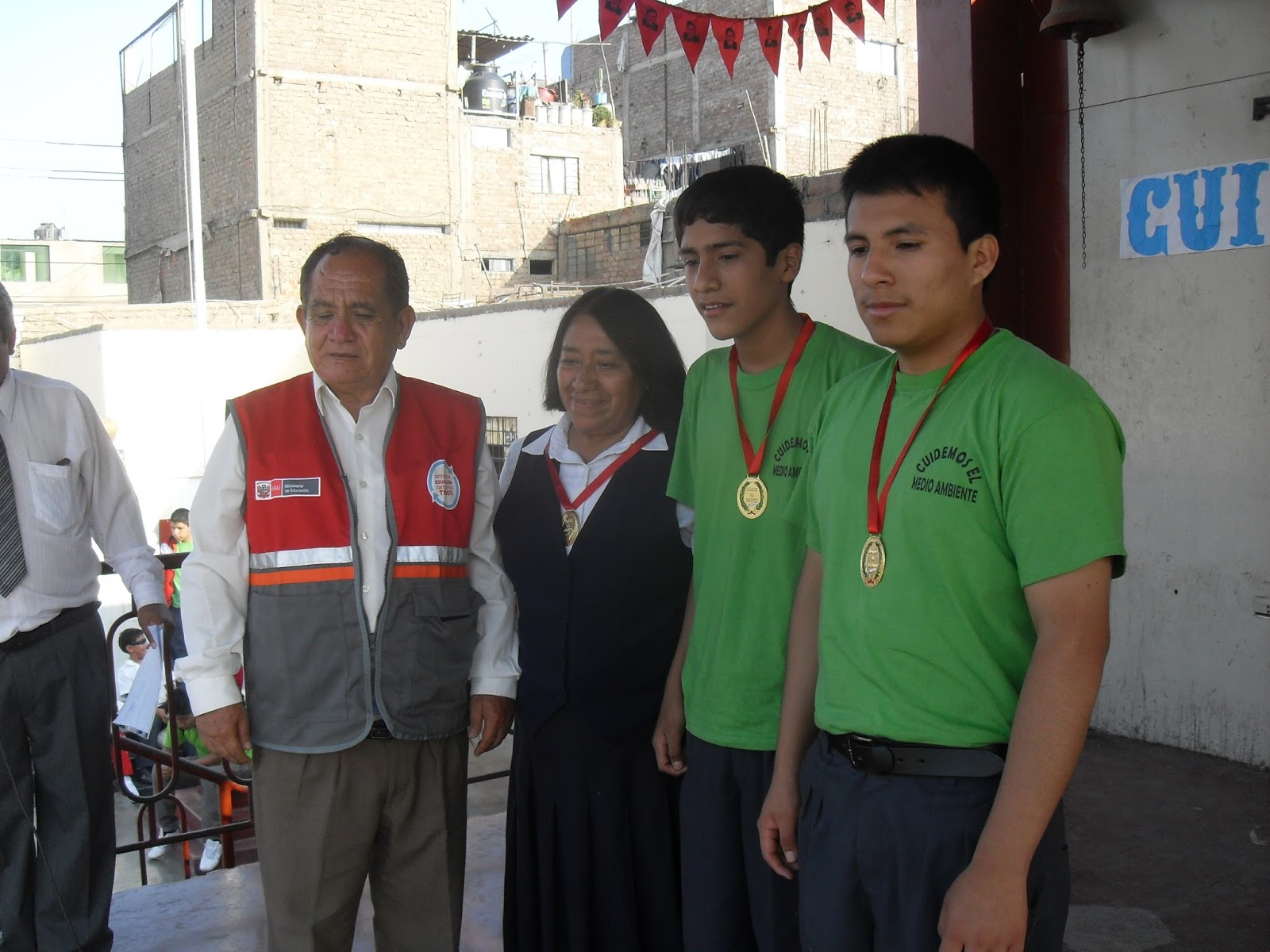 Marcos, Juan Carlos, Hna Aurea Roldán y el director Edwin Aroca de la Ugel 01.